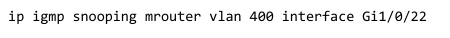 Designar portas mrouter estáticas. O comando ip igmp snooping vlan mrouter permite configurar portas específicas como conectadas a roteadores ou geradores de multicast, garantindo que os relatórios IGMP sejam encaminhados corretamente. No switch da Fonte Grande, a porta Gi1/0/22 (tronco para a Sede) é definida como mrouter para a VLAN 400:
