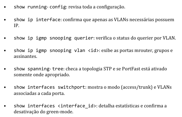 • Mitigação de perda de pacotes MPEG: o uso correto de IGMP snooping, definindo queriers e mrouter‑ports, garante que o tráfego multicast seja entregue apenas aos interessados, evitando flooding e congestionamento. Quando necessário, a política de QoS pode garantir tratamento prioritário aos pacotes de vídeo.