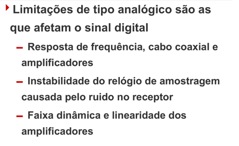 O desempenho de uma interface de vídeo serial digital (SDI) está sujeito a limitações que lembram o mundo analógico. De acordo com o material de referência, três fatores principais degradam o sinal digital: a resposta de frequência dos cabos coaxiais e dos amplificadores, a instabilidade do relógio (clock) de amostragem causada pelo ruído no receptor e a faixa dinâmica/linearidade dos amplificadores. Estes fatores, resumidos, demonstram que nem mesmo um sistema digital está livre das imperfeições físicas dos componentes.
