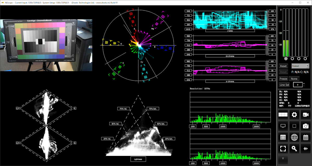 - Monitorar a imagem final e seus parâmetros analógicos usando instrumentos como osciloscópios de forma de onda (waveform) e analisadores de vetor (vectorscope).