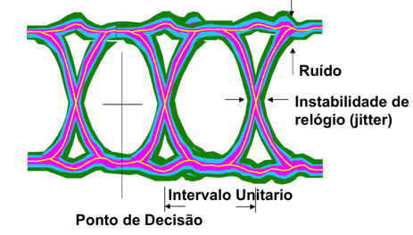 O diagrama de olho é uma ferramenta gráfica utilizada para inspecionar a integridade de sinais digitais. Sobrepondo vários bits consecutivos, forma‑se uma figura que se assemelha a um olho. No interior dessa figura é possível observar a margem de ruído (abertura vertical), o jitter ou instabilidade temporal (largura na região central), o intervalo unitário (largura de um bit) e o ponto de decisão onde o receptor deve diferenciar entre 0 e 1. A figura abaixo ilustra esses elementos.