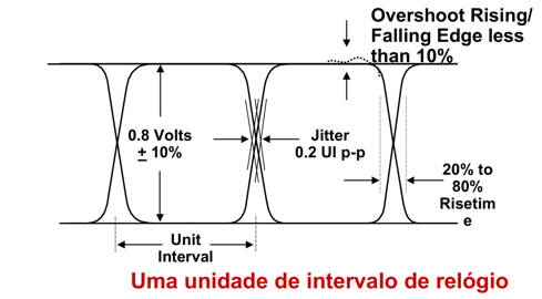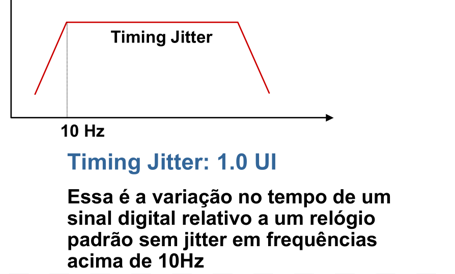 - Timing jitter (1,0 UI): variação no tempo de um sinal digital em relação a um relógio ideal sem jitter para frequências acima de 10 Hz.