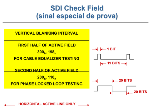 Para provar os limites de funcionamento da interface SDI utiliza‑se um padrão especial chamado SDI Check Field. O teste consiste em somar segmentos de cabo coaxial até que ocorram erros e transmitir um sinal "complicado" que concentra energia em baixas frequências. O padrão força o equalizador automático e o circuito de extração de relógio (PLL) a operarem em seus limites; por isso, é adotado em geradores de vídeo e incluído na recomendação SMPTE RP178.